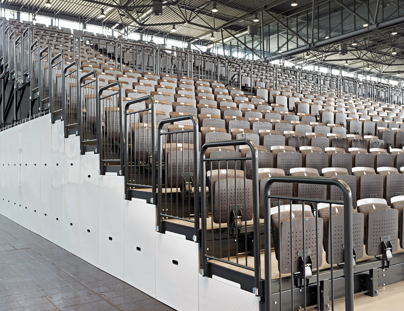 Each year Leipziger Messe organizes approximately 40 fairs, 100 congresses and other events with a total of 10,000 exhibitors and 1.3 million visitors. In the middle of the exhibition centre is a 19,446 m² large glass hall, which is connected to the multi-purpose event hall, 4 exhibition halls and a convention centre. Elan Inventa developed a Transflex solution, which met Leipziger Messe's needs of mobility and multipurpose usability of the seating systems.